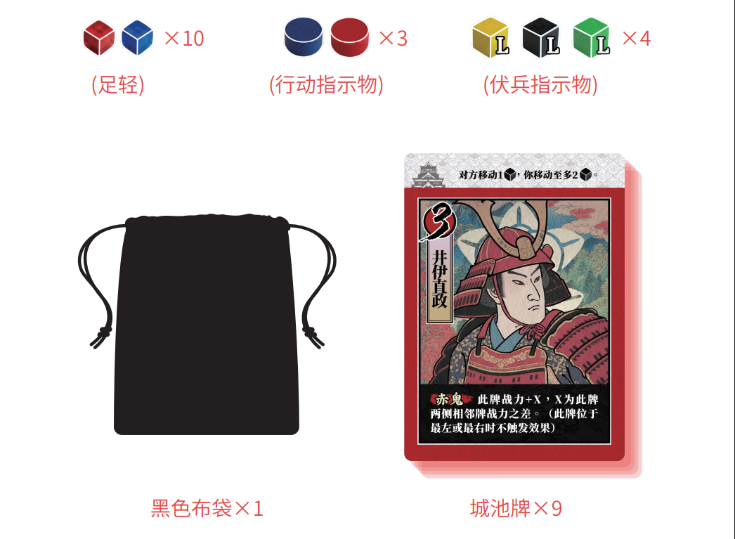 最近看过日剧的玩家成为起始玩家,拿取10个足轻和3个行动指示物。后手玩家拿取10个足轻和3个行动指示物。双方将足轻格子放在一旁形成自己的供应堆。