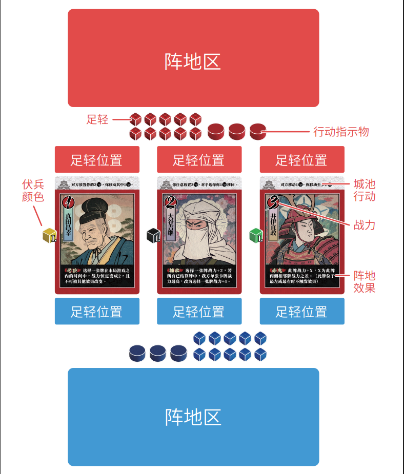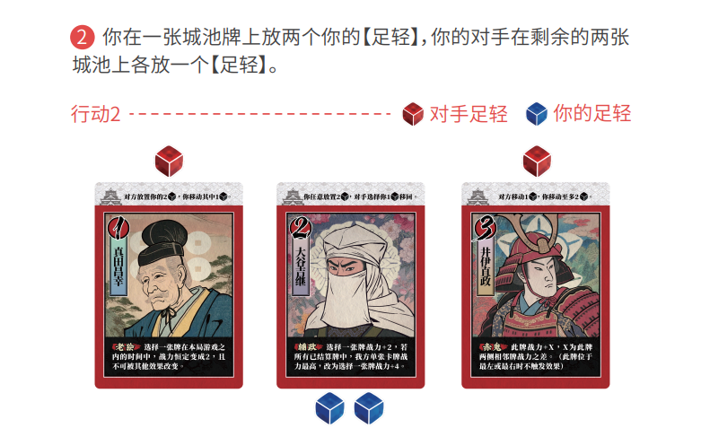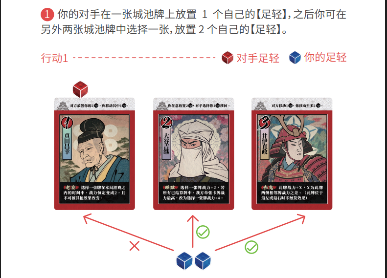 首先你放置你的2个【足轻】,这些足轻可以全部放在一张城池牌上,也可以在两张牌上各放一个【足轻】,然后你的对手可以选择任意一张城池牌上你的一个【足轻】移出城池牌。被移出的【足轻】在之后的轮次还可以使用。只要是城池牌上你的【足轻】,对手都能选择,并非只能选择你刚刚放置的【足轻】。