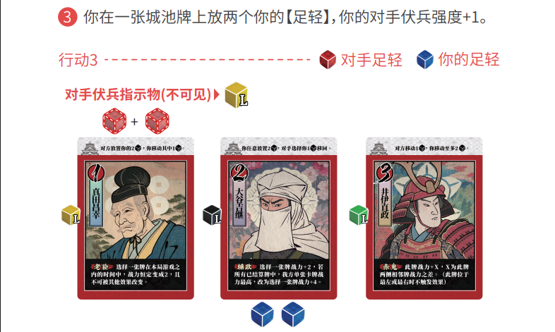 当双方玩家均执行完3个行动后,双方展示自己的伏兵,根据抽到的伏兵指示物颜色,在场上对应颜色伏兵指示物下方的城池牌上放置自己的【足轻】,放置数量等于伏兵强度(初始强度为 1)。