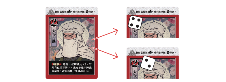 首先由你的对手放置你的2个【足轻】,这些足轻可以全部放在一张城池牌上,也可以在两张牌上各放一个【足轻】,然后,你可以选择对手刚刚放置的你的一个【足轻】,将它从原本所在的城池牌移动到另一张城池牌上。你也可以不移动。